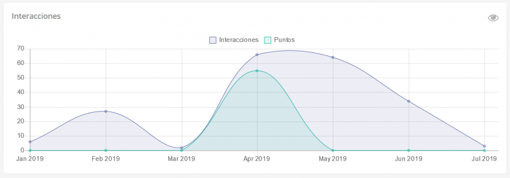El gráfico de líneas de interacciones muestra qué tan activo estuvo el contacto en los últimos 6 meses. Las interacciones son cualquier acción que el contacto haya hecho. Por ejemplo: visita a páginas de destino, envío de formularios, correo electrónico abierto y así sucesivamente. El gráfico muestra también los puntos que el contacto ha recibido.