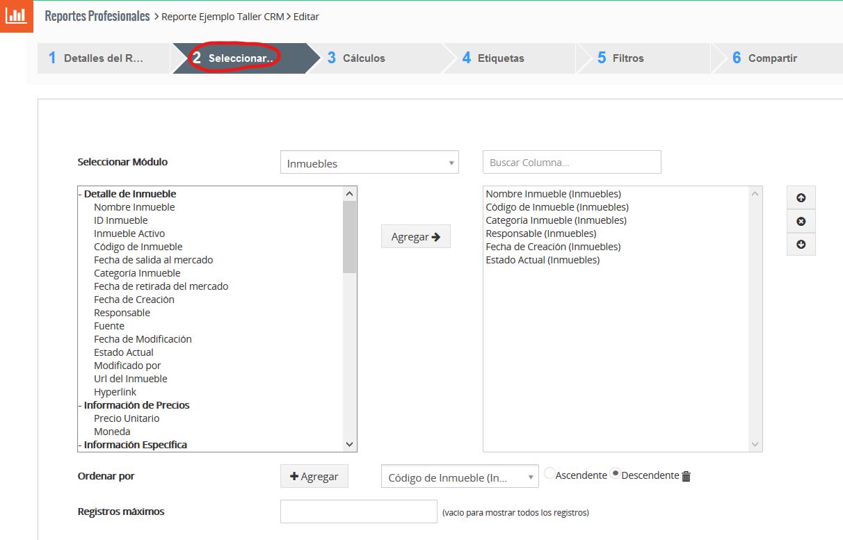 En este paso, puede seleccionar los campos para mostrar en el informe con detalles. Estos campos se pueden seleccionar del módulo Informe seleccionado en Detalles del informe y sus módulos relacionados. Elija uno de los módulos disponibles en las opciones de “Seleccionar módulo” y, para facilitar la navegación, escriba parte del nombre del campo en el cuadro de entrada de búsqueda. El bloque Limitar y ordenar le permite limitar y ordenar registros detallados. También existe la opción de ordenar por más de una columna.