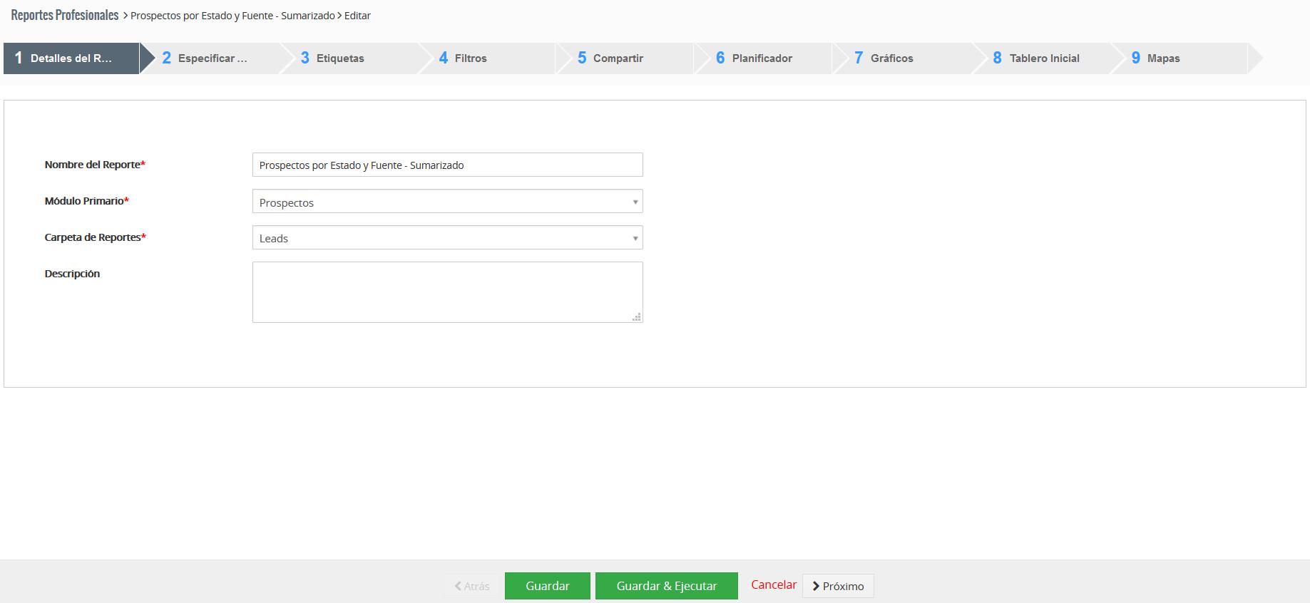 - Área de botones: Hay botones para Cancelar, Guardar, Guardar y ejecutar, pestaña Atrás / Siguiente