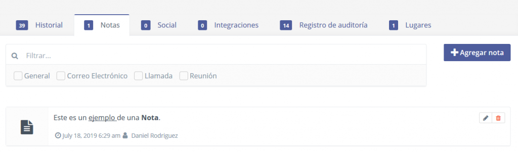 TecnoMatic puede ser utilizado como un CRM básico. Usted o sus compañeros de equipo pueden escribir notas para un contacto específico. Se puede marcar una nota con un propósito específico: general, correo electrónico, convocatoria, reunión. También es posible definir una fecha de una reunión o una llamada. Si lo hace así, la nota también aparecerá en el calendario TecnoMatic.