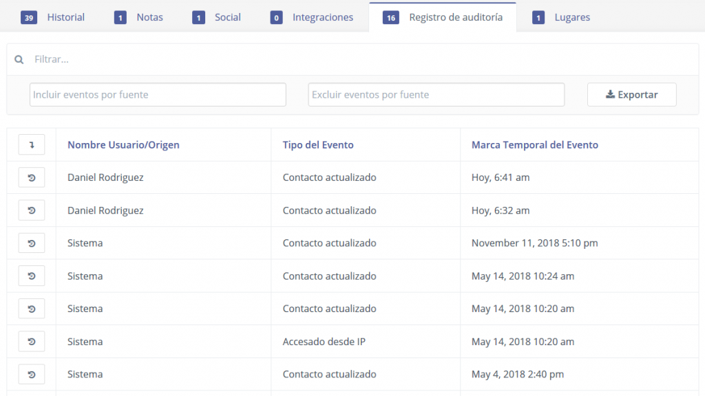 Presenta la bitácora (logs) registrada para todas las acciones y/o interacciones realizadas por el contacto en los sitios webs monitoreados por la plataforma.