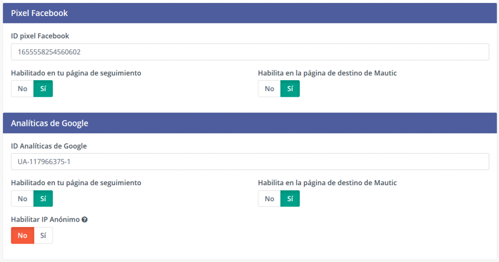 TecnoMatic admite el seguimiento de contactos con Google Analytics y con el Pixel de Facebook. Para esto, vaya a las Configuraciones de Seguimiento de TecnoMatic donde encontrará las secciones para: