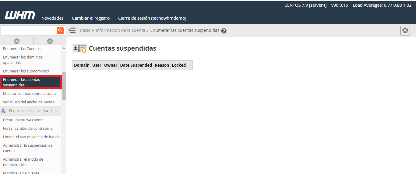 - Motivo : muestra el motivo de la suspensión de la cuenta, si el usuario de WHM que suspendió la cuenta ingresó un motivo.