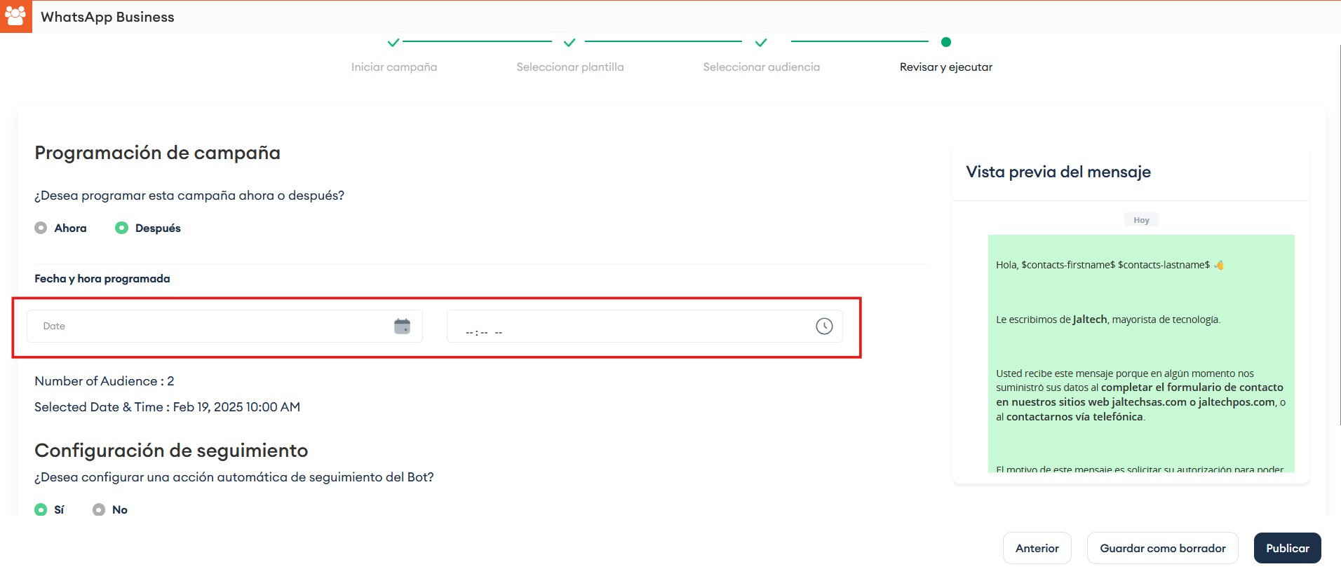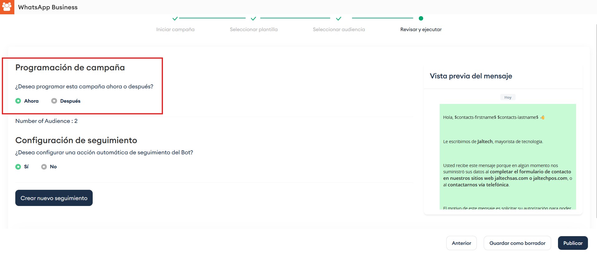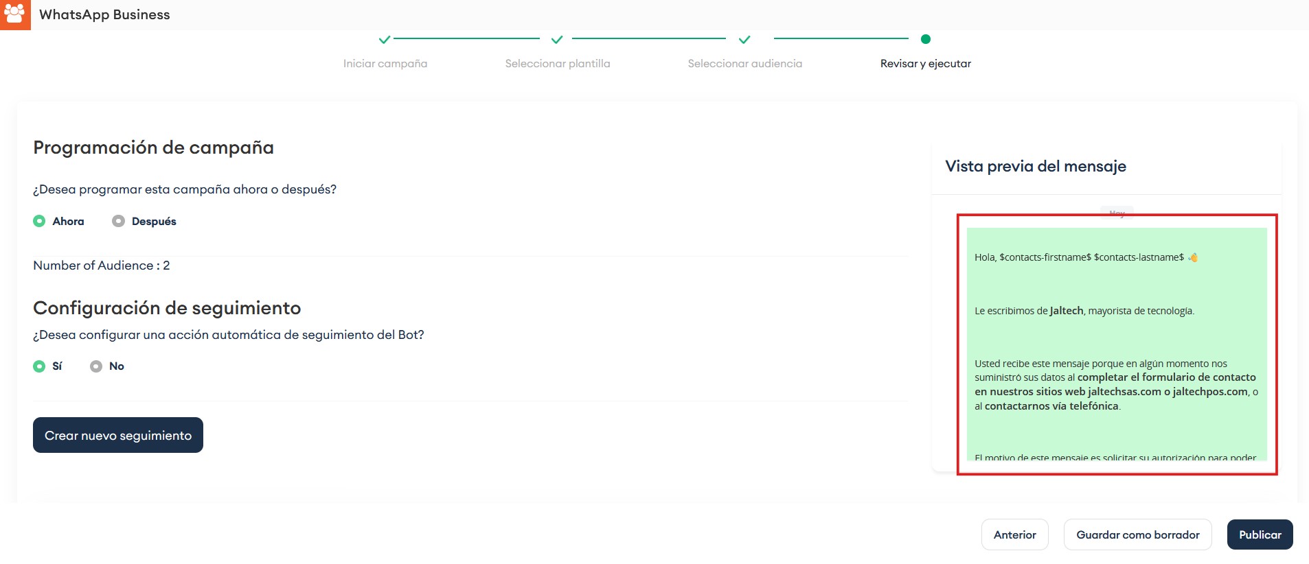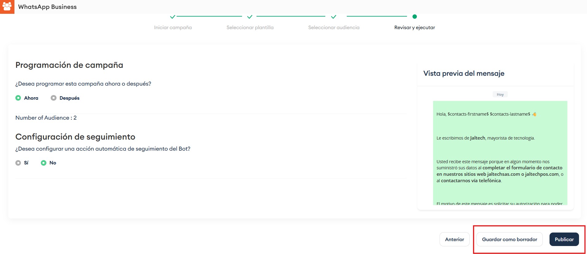 - Al hacer clic en “Guardar en borrador”, la campaña se guardará en su estado actual y aparecerá en la Lista de difusión.