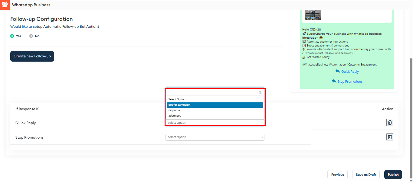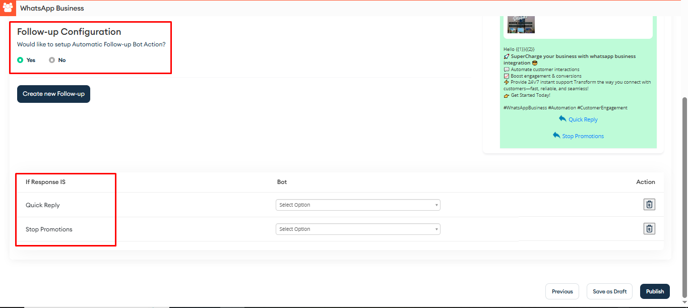 Puede seleccionar Sí o No para activar o desactivar la acción automática del bot de seguimiento.
