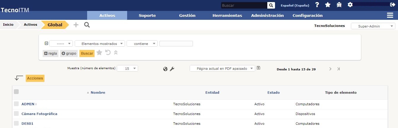 El menú Activos > Global le permite realizar una búsqueda global en todos los artículos a los que tiene acceso. Esta búsqueda se limita a computadoras, monitores, impresoras, equipos de red, periféricos y teléfonos.