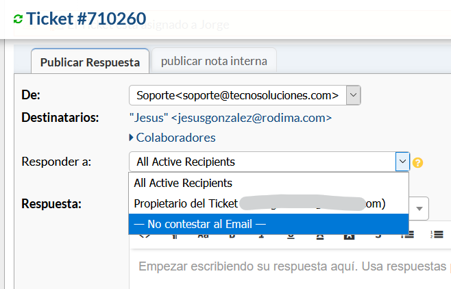 Si se requiere una respuesta pero el Agente no desea enviar la respuesta al usuario pero aún publicar la respuesta en el hilo del ticket, puede seleccionar “No responder por correo electrónico” en el menú desplegable sobre el cuadro de respuesta para el usuario. Esto tampoco enviará respuestas por correo electrónico a ningún colaborador en el ticket.