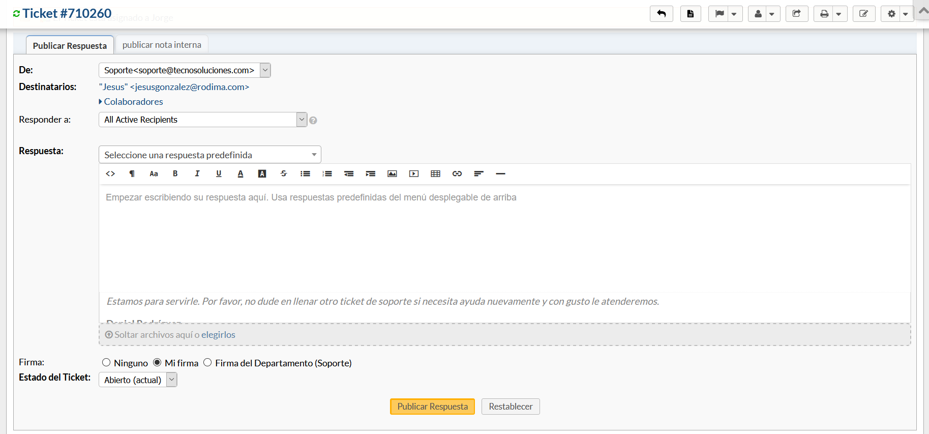 Esta respuesta estará en el hilo y será visible para el propietario del ticket y cualquier colaborador cuando verifiquen el estado del ticket desde el Portal del Cliente de la mesa de ayuda.
