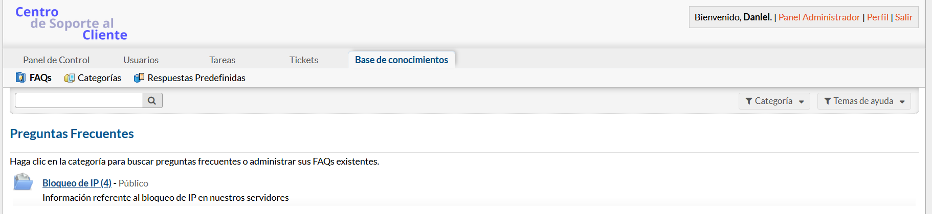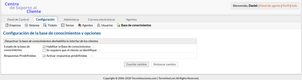 Primero, la base de conocimientos deberá estar habilitada para la interfaz del cliente yendo a Panel de administración > Configuración > Base de conocimientos.