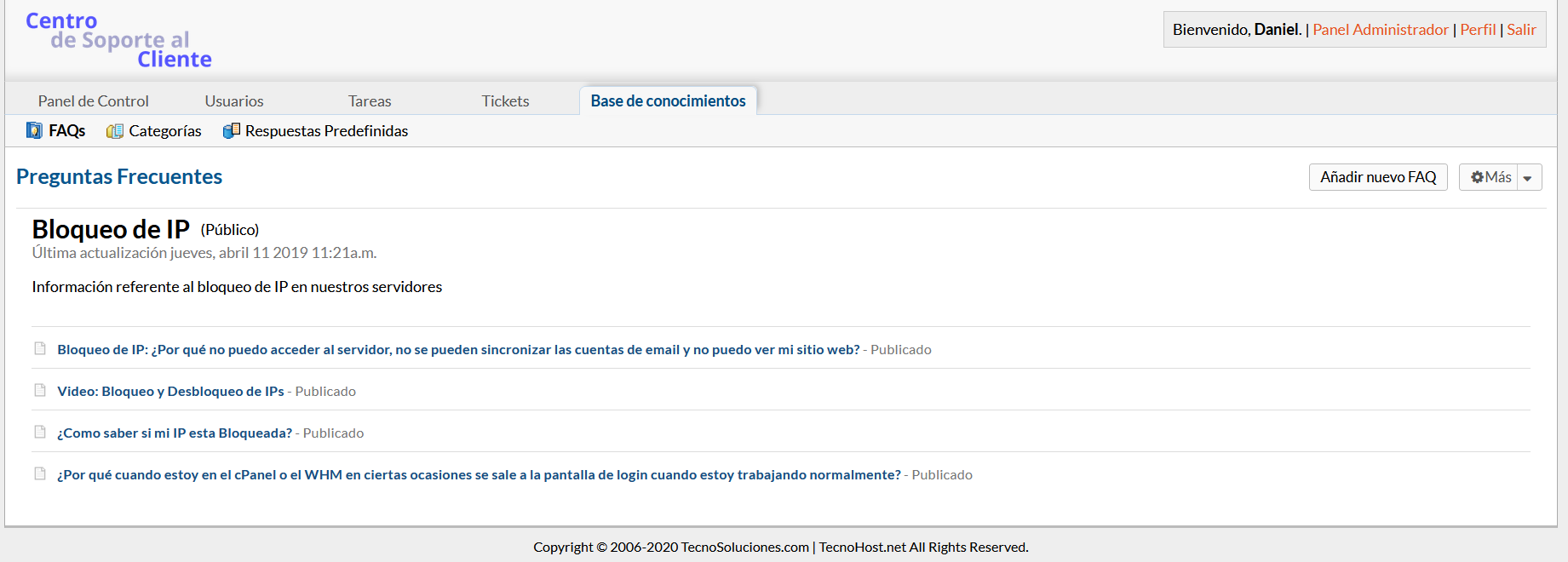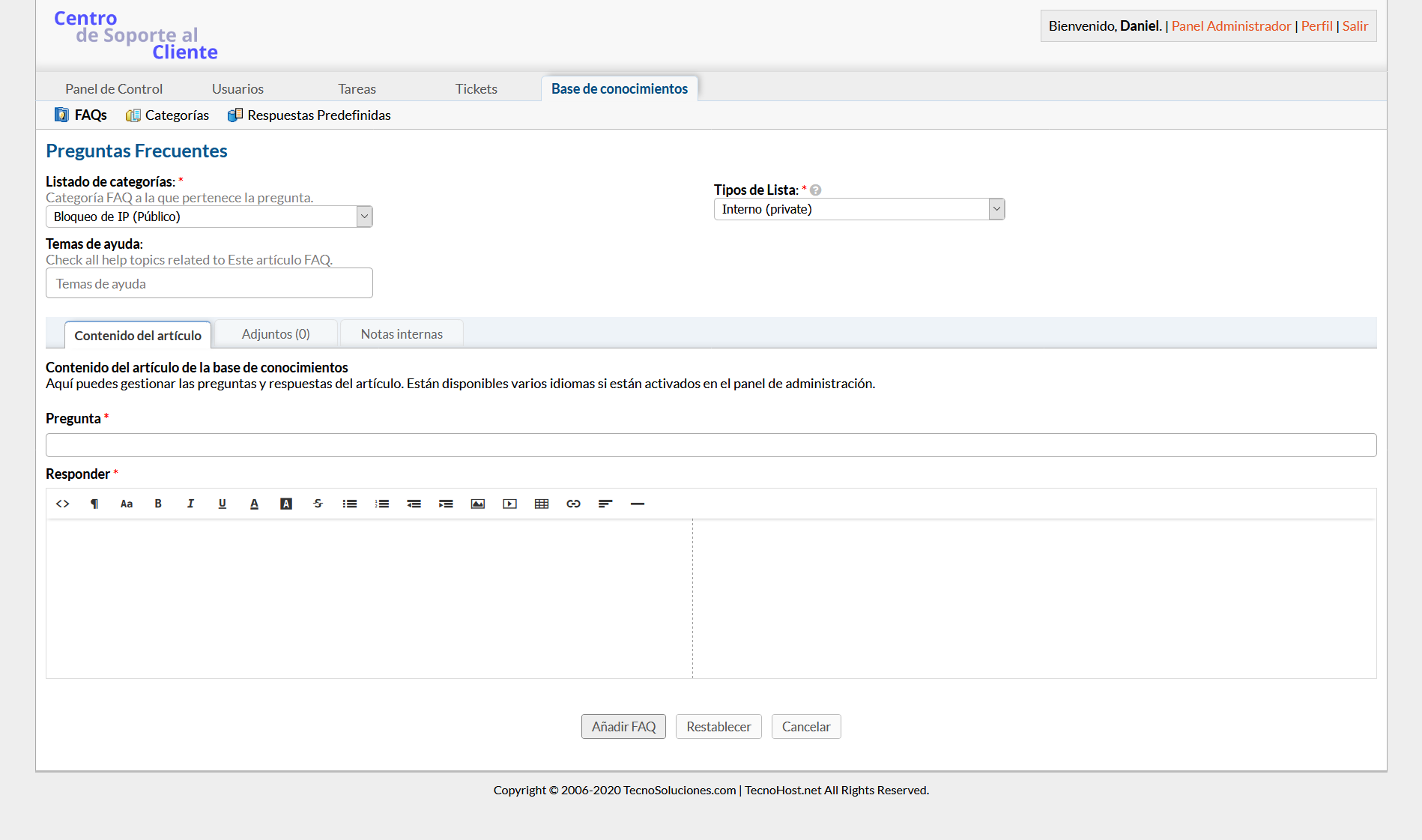 Las preguntas frecuentes pueden tener archivos adjuntos, texto HTML / RIch y también estar asociadas con temas de ayuda específicos de la mesa de ayuda. Esto es útil cuando los clientes están buscando a través de la Base de conocimientos desde el Portal del cliente; pueden seleccionar el tema de ayuda y luego ver solo las preguntas frecuentes que se han asociado con ese tema.