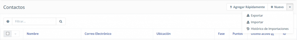 - En la esquina superior derecha sobre la tabla de contactos, abra el submenú de acciones y seleccione la opción Importar.