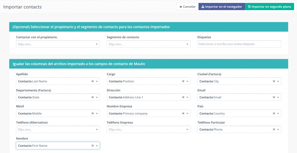 - La página de mapeo de campos debería aparecer. El primer conjunto de opciones le permitirá seleccionar propietario, segmento y etiquetas para asignar globalmente a todos los contactos importados. El segundo conjunto de opciones le permitirá asignar las columnas de su CSV a TecnoMatic contactar campos personalizados. El tercer conjunto de opciones le permitirá asignar columnas de su CSV a atributos de contacto especiales como fecha de creación y así sucesivamente.