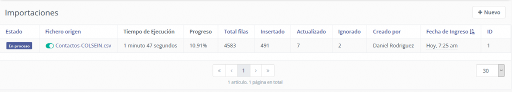 La tabla le mostrará estadísticas básicas sobre todas las importaciones, cuáles son los estados actuales y cuál era el nombre del archivo CSV. También está el interruptor que le permitirá detener e iniciar las importaciones en cola o en proceso.