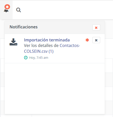 La lista de importaciones se puede encontrar al ir al área de Contactos, abrir el menú de acción sobre la tabla de contactos y elegir la opción Histórico de Importaciones.