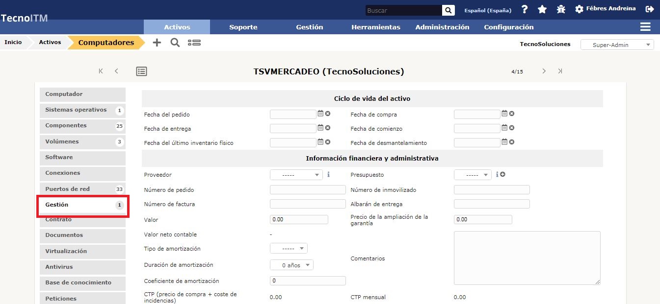- Proveedor: tercero que vendió el equipo. Ver Administrar proveedores ;
