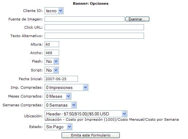 La segunda parte consiste en colocar, en otro formulario (Agregar un Banner), los datos sobre el Banner (Previo diseño del mismo) a publicar: