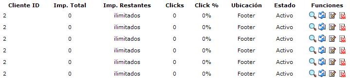 El cuadro tiene también el número de Impresiones, las Impresiones Restantes (Puede ser: ilimitado), número de Clicks y su porcentaje (%), colocación o ubicación de cada banner dentro del Portal, Estado y Funciones. Este último es muy importante, ya que el Administrador tiene la facultad de Editar, Desactivar o Borrar un banner con solo hacer click en cualquiera de esos enlaces. Ejemplo general: