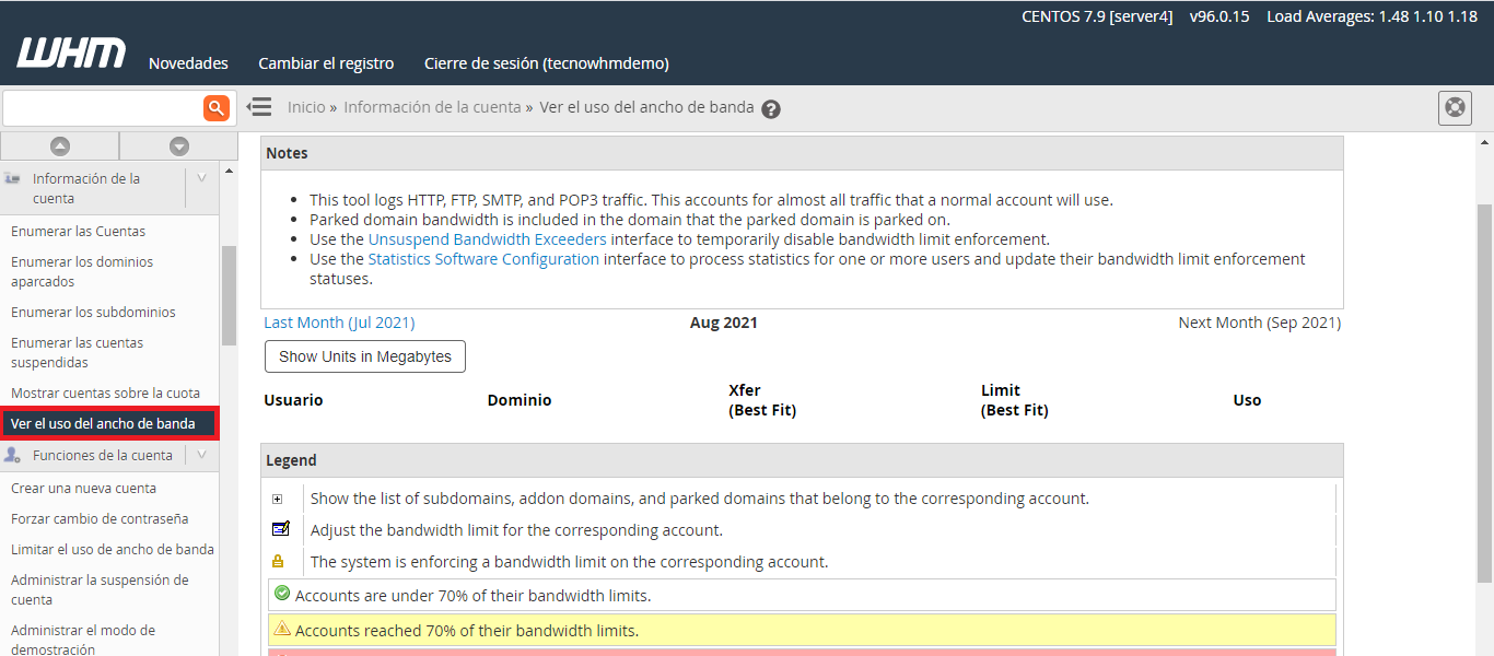 Esta interfaz monitorea el tráfico de HTTP (tráfico del navegador), FTP (archivos transferidos), SMTP (correo enviado) y POP3 / IMAP (correo recibido). Esto puede causar algunas discrepancias entre la información que proporciona WHM y la información que proporcionan los programas de procesamiento de registros (como AWStats, Webalizer o Analog). Para obtener más información, lea nuestra documentación sobre Discrepancias aparentes en las estadísticas de uso del ancho de banda .