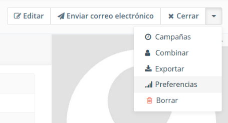 Al administrar un contacto, puede establecer la preferencia de comunicación de los contactos. Puedes acceder al Centro de Preferencias del contacto al ver el perfil de un contacto. En el menú desplegable, haga clic en el menú de preferencias. Una nueva ventana modal debe aparecer con una pestaña para establecer los canales preferidos y la frecuencia de contacto, así como la opción de pausa de la comunicación dentro de un período de tiempo determinado. La segunda pestaña le dará la opción de agregar o eliminar el contacto de las categorías globales utilizadas en correos electrónicos o categorías. La tercera pestaña permitirá agregar o eliminar el contacto de los segmentos a los que pertenece.