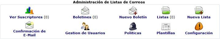 - Ver Listas: Permite ver, modificar y eliminar todas las listas de correo creadas para el portal. Muestra en un cuadro las listas de correos configuradas por categorías, cada una con una breve descripción, número de suscriptores y opciones de editar / borrar. Si no se han configurado alguna categoría, muestra la categoría General “Todos los Usuarios”