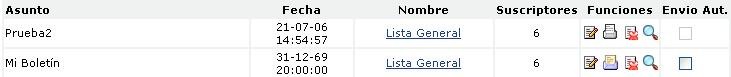 - Ver Boletines: Permite visualizar de manera rápida los boletines creados y la cantidad de suscriptores vinculado con la misma. Además de tener funciones especificas para cada boletín como: Editar, Enviar Boletín de manera Manual, Eliminar, Ver y Envió Automático.