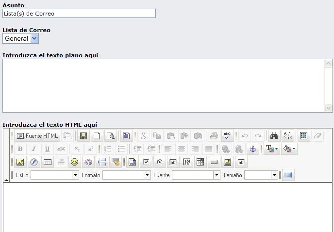 Crear un nuevo Boletín: Permite crear nuevo boletines informativos, en dos tipo de formatos necesarios (Texto Plano y HTML) para su envió. Para tal fin, se debe llenar un formulario donde se coloca el título, se selecciona el nombre de la lista al cual pertenece, se introduce el texto plano y/o en HTML a través de un amigable editor En Línea. Además, si se desea, se puede agregar un Artículo / Noticia, imágenes, un Banner, objetos de Flash, noticias y/o artículos publicados en el portal, entre otros. Parte del formulario se muestra a continuación.