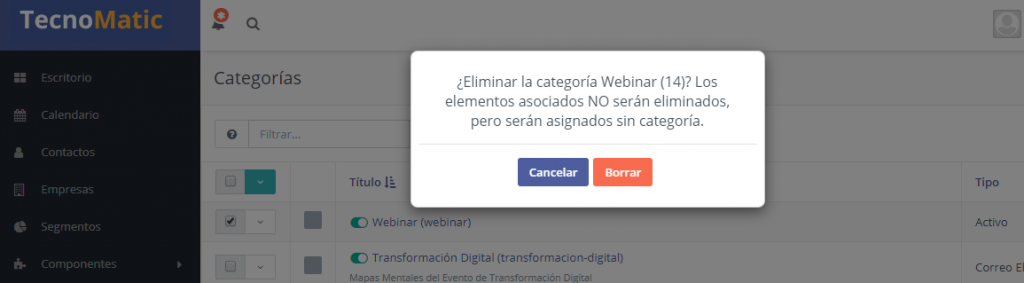 Las categorías se pueden eliminar haciendo clic en la flecha al lado de la casilla de verificación y seleccionando eliminar. Si existe algún activo asignado a la categoría que se está eliminando, no se eliminará, sino que se mostrará como “Sin asignar”. Una advertencia se mostrará, lo que le avisa de este hecho al eliminar una categoría.