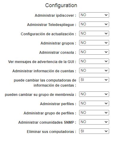 - Administrar grupos: da derecho a un perfil para administrar grupos de máquinas. Crear/eliminar/modificar y agrupar, insertar máquinas en grupos.