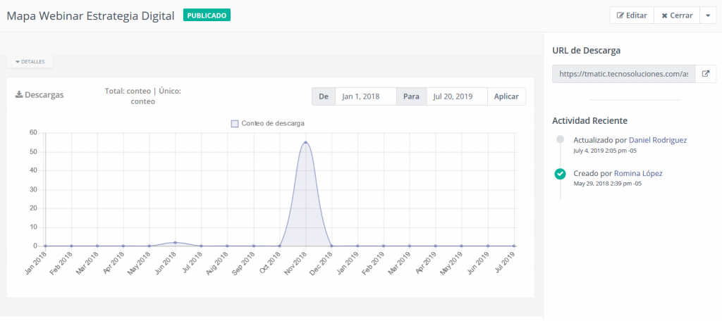 La pantalla de visualización de activos proporciona información sobre la cantidad de veces que se ha descargado el activo, que puede ser mostrado en un gráfico por horas, diario, semanal, mensual o anual. El gráfico también muestra el número de únicas, versus visitas totales: esto indica si algunos visitantes han descargado el mismo recurso varias veces.
