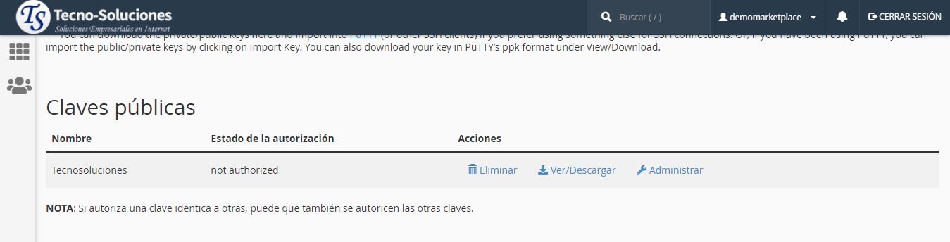 Importante: Usted debe autorizar nuevas claves antes de intentar utilizarlos.Nota: Esta columna solo se muestra en la tabla Claves públicas . -