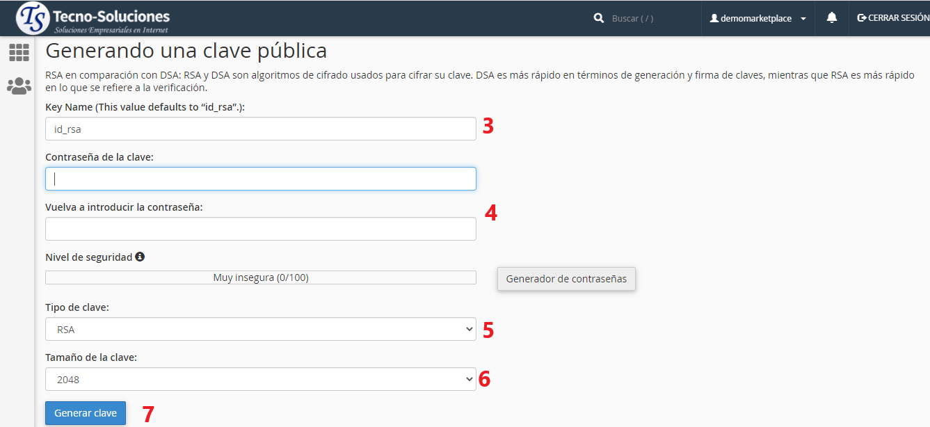 4. Pegue las claves pública y privada en los cuadros de texto correspondientes.