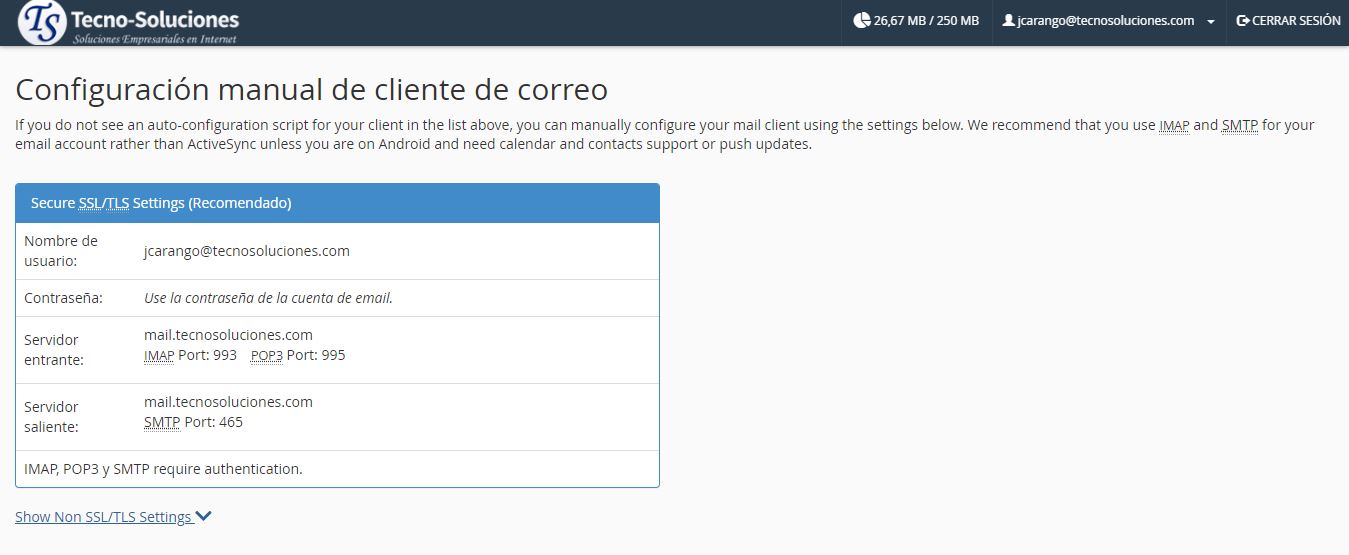Para configurar manualmente su cliente de correo, use la información en Configuración manual del cliente de correo . Nosotros fuertemente recomendamos que utilice la muestra valores de SSL / TLS.