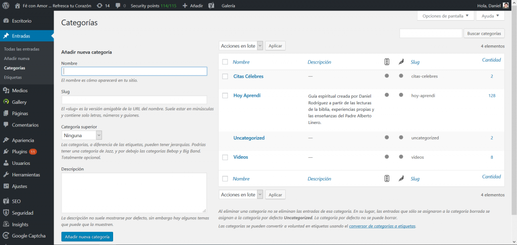 Para crear una categoría, seleccionamos Entradas -> Categorías: