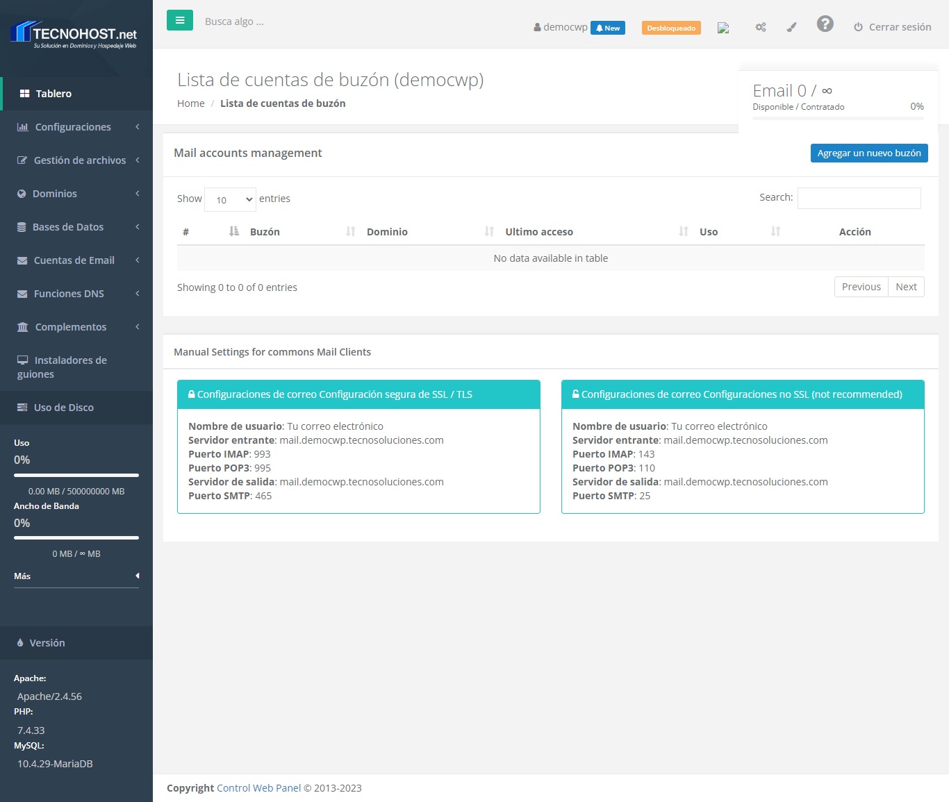 Este módulo le permite crear las cuentas de correo electrónico asociadas al usuario.