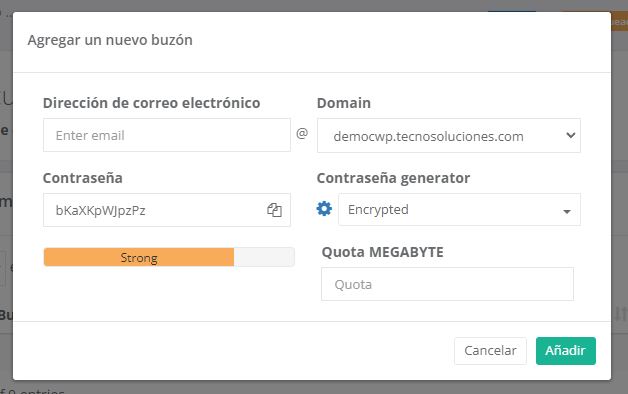 Escriba la dirección de correo electrónico , seleccione el dominio , la contraseña , si lo desea, el sistema puede generar una contraseña, con la opción Cifrar puede elegir la longitud, escribir alfanumérico, alfanumérico y alfanumérico+símbolos, Cuota MB y haga clic en Agregar .