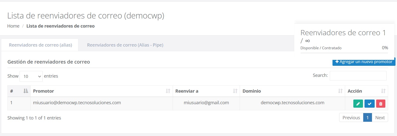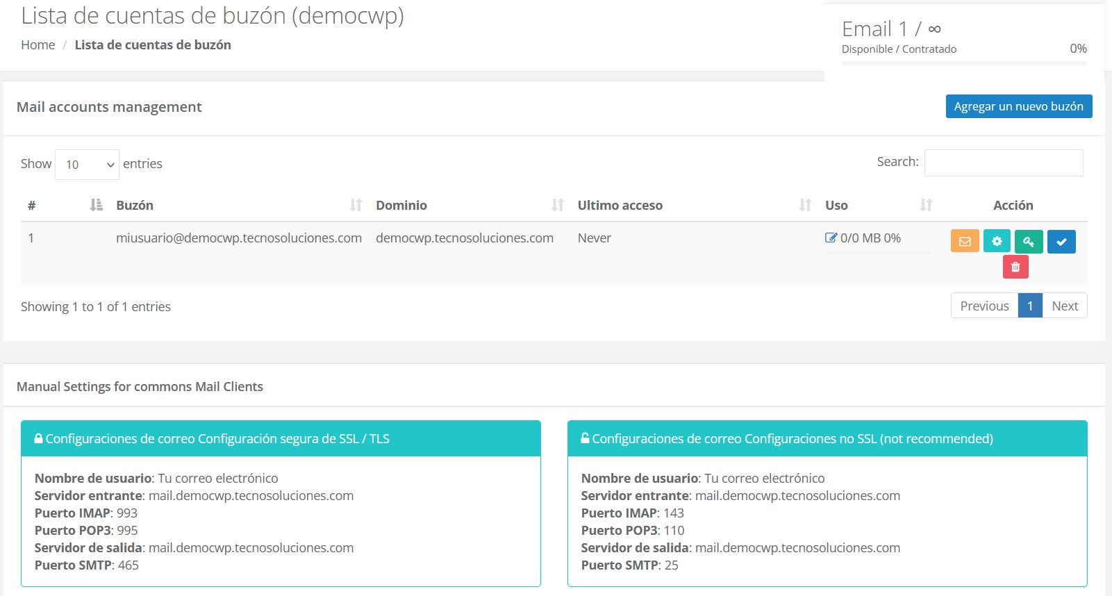 Listado de cuentas de Mail Box y Mail Forwarders con sus descripciones, aquí podrás contar con acciones para: