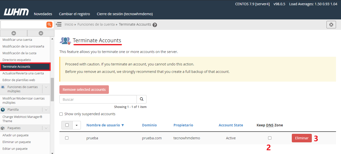 Para cancelar varias cuentas de su servidor, realice los siguientes pasos: