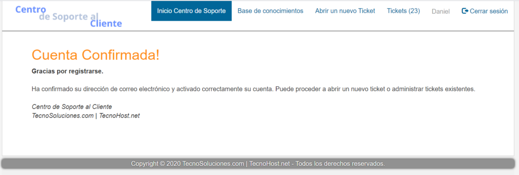 Una vez que ha hecho clic en el enlace que le llegó al email, el sistema le informa que la cuenta ya ha sido confirmada: