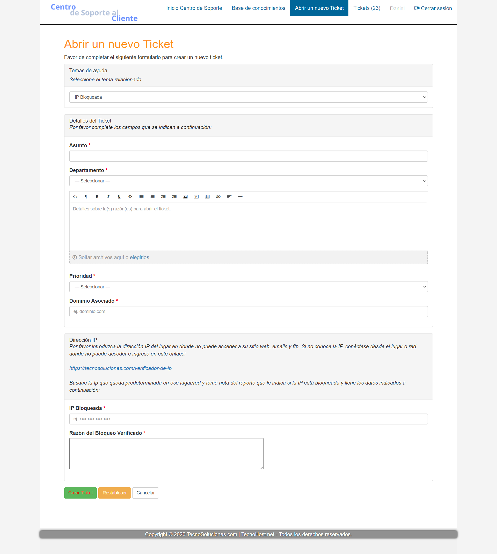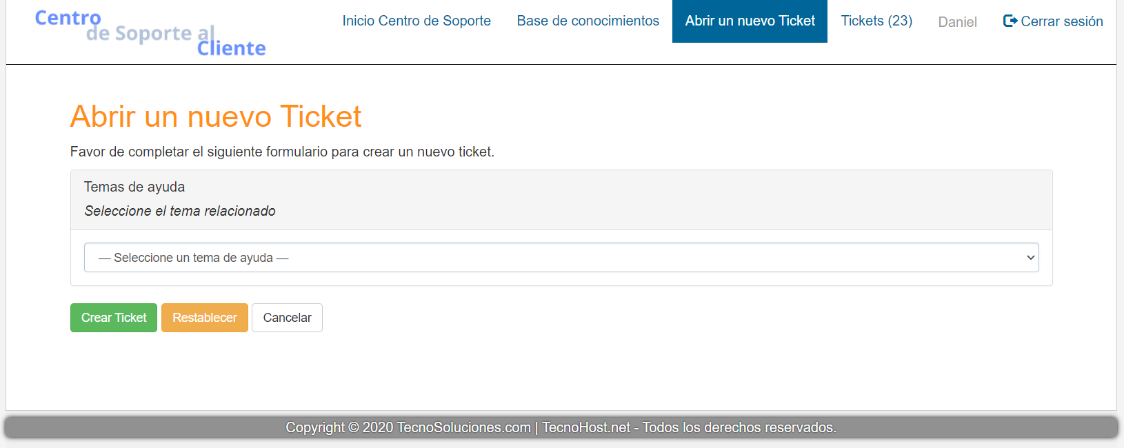 Al iniciar la sesión será redirigido a un formulario de ticket en blanco, donde se le solicitará primero seleccionar el Tema de Ayuda:
