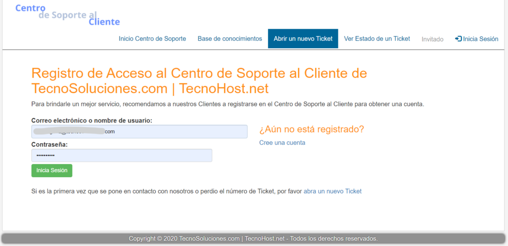 Para abrir un nuevo ticket, deberá visitar la página del portal del cliente de la mesa de ayuda. Una vez que haya llegado a esa página, haga clic en la pestaña “Abrir un nuevo ticket“.