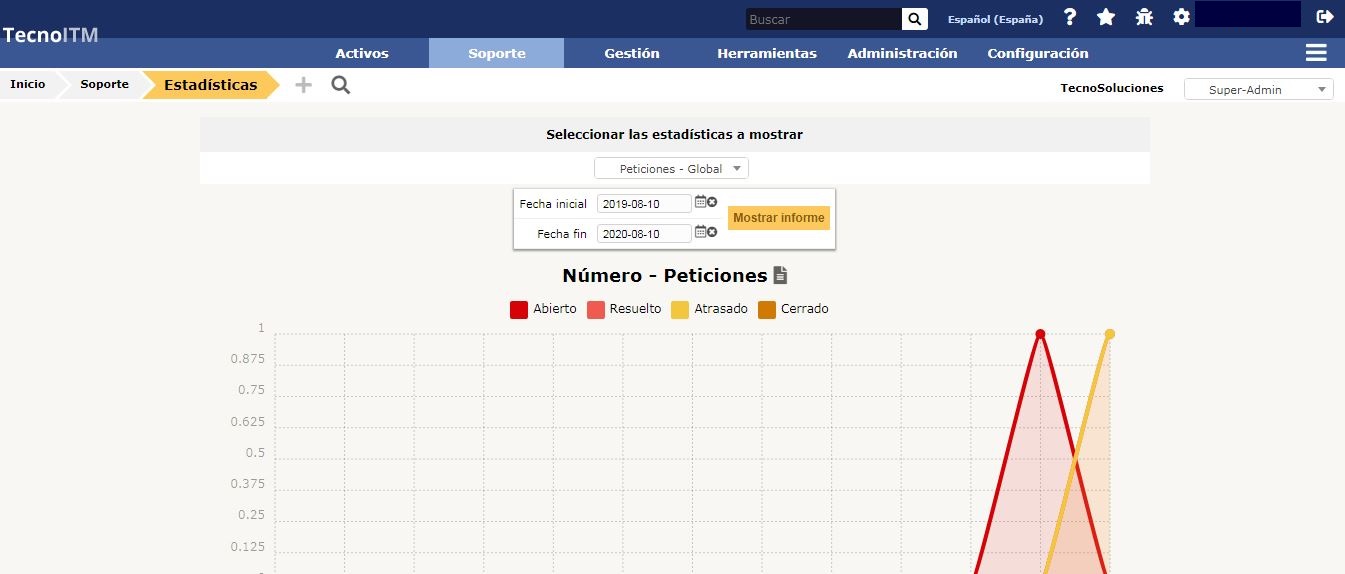 Los informes sobre las peticiones están disponibles en el menú Soporte > Estadísticas