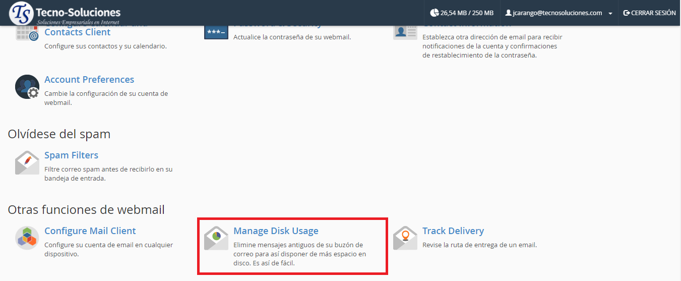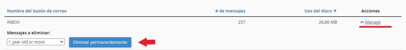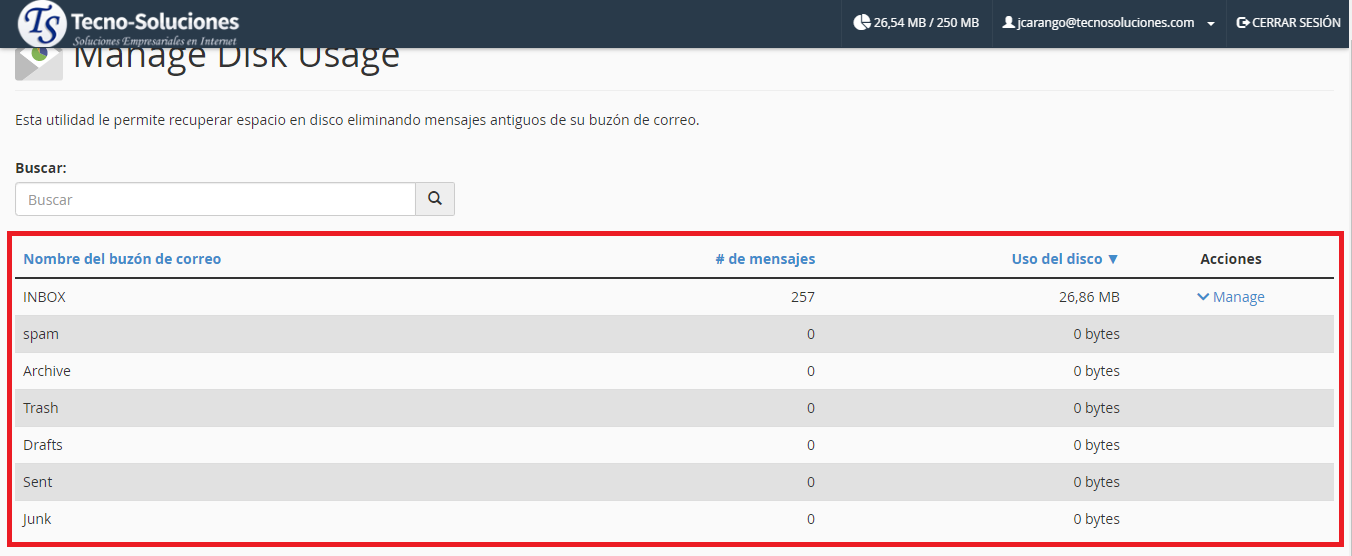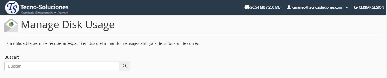 Utilice esta interfaz para liberar espacio en disco. Puede ver todos sus buzones de correo y eliminar mensajes antiguos o grandes.