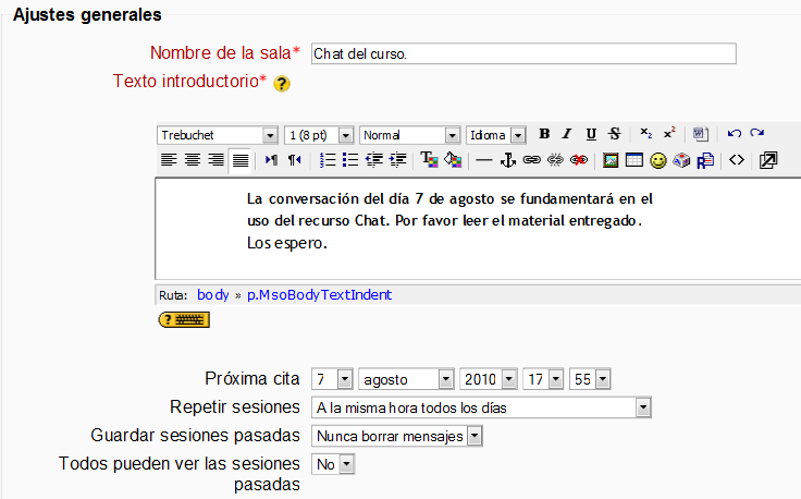 - Nombre: Es el nombre de esta sala de chat, el texto con el que aparecerá listada en el bloque temático en el que estamos insertando. No debe ser un texto demasiado largo. Se pueden usar marcas HTML explícitas para dar formato y conseguir efectos de texto.