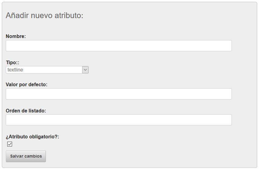 Tipo [menú desplegable]: Cada atributo tiene un tipo único. Véase: Tipos de atributos más abajo.