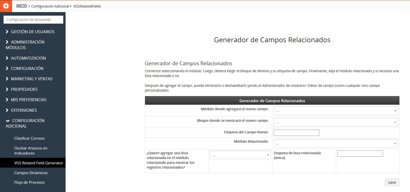 Ingrese en Configuración > Configuración CRM > CONFIGURACIÓN ADICIONAL > Generador de Campos Relacionados (Related Field Generator).