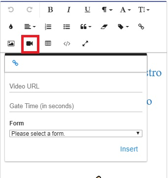 Para usar un video confinado en su página de destino, simplemente haga clic en un área de texto en el generador de plantillas y verá el editor Froala emergente. En la fila superior, junto al icono Insertar imagen, se encuentra el icono ‘Insertar video bloqueado’. Haga clic en ese, y usted puede luego usar el modal que se abre para insertar videos confinados en su página de destino.