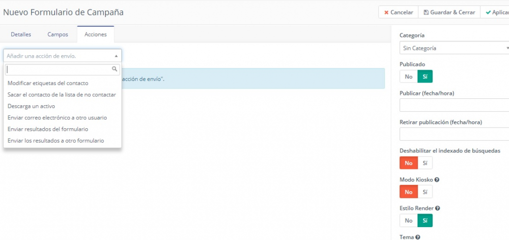 Las acciones de formulario son elementos que deben manejarse en el envío del formulario. Puede definir múltiples acciones a realizar en cada emisión. Hay diferentes acciones disponibles según el tipo de formulario.