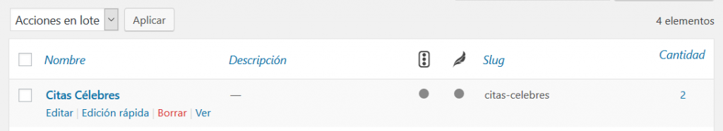 También podemos hacer clic en el cuadrado a la izquierda del nombre para seleccionarlo, y de la parte de arriba, donde pone “Acciones en lote” seleccionar la opción “Borrar” y pinchamos en Aplicar: