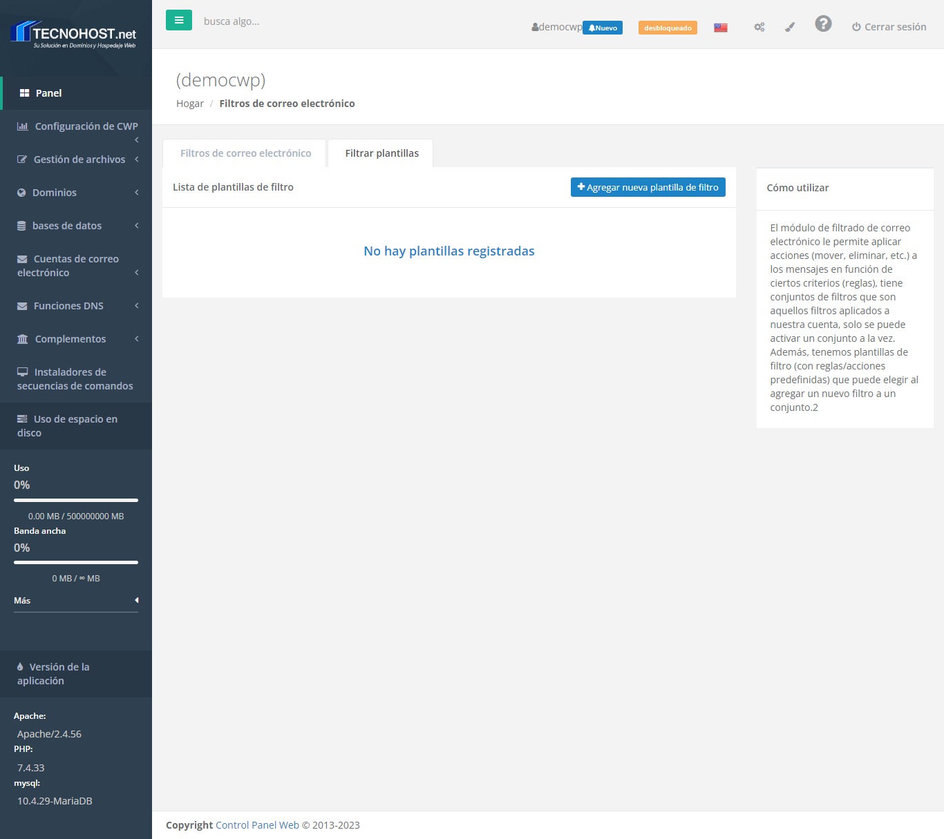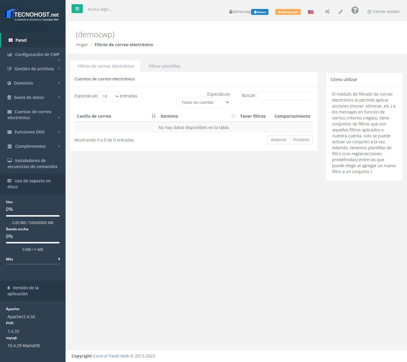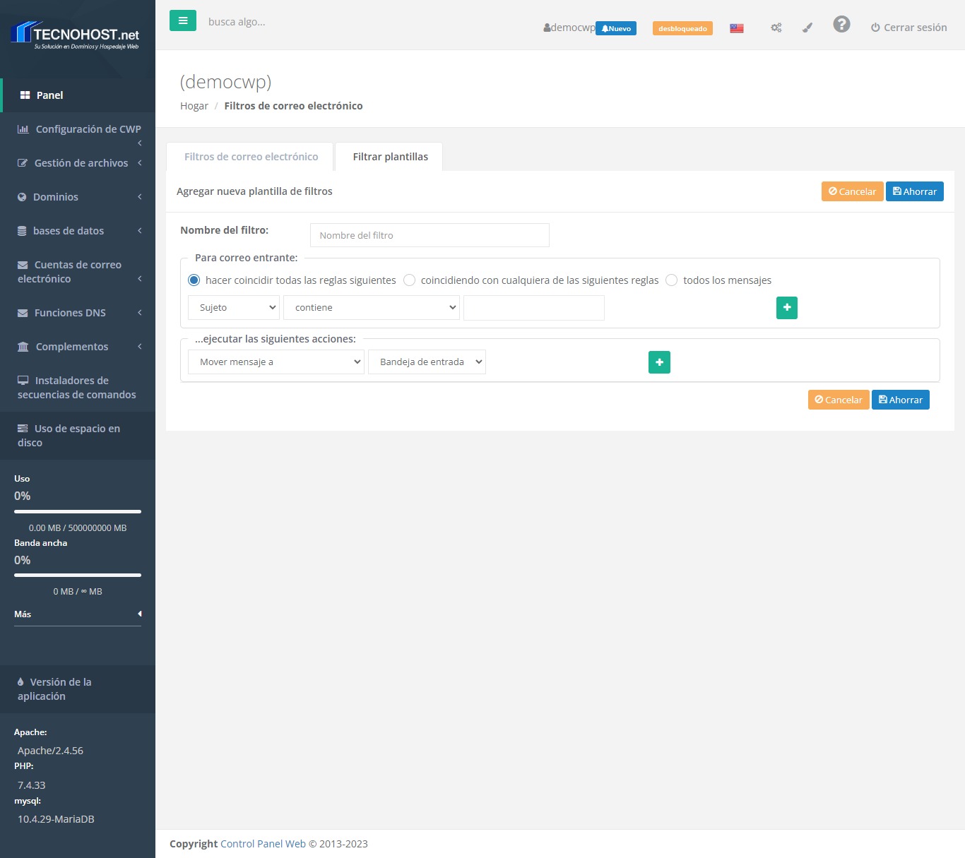 El módulo de filtrado de correo electrónico permite aplicar acciones (mover, eliminar, etc.) a los mensajes en función de ciertos criterios (reglas), tiene Conjuntos de filtros que son aquellos filtros aplicados a nuestra cuenta, solo se puede activar un Conjunto a la vez.