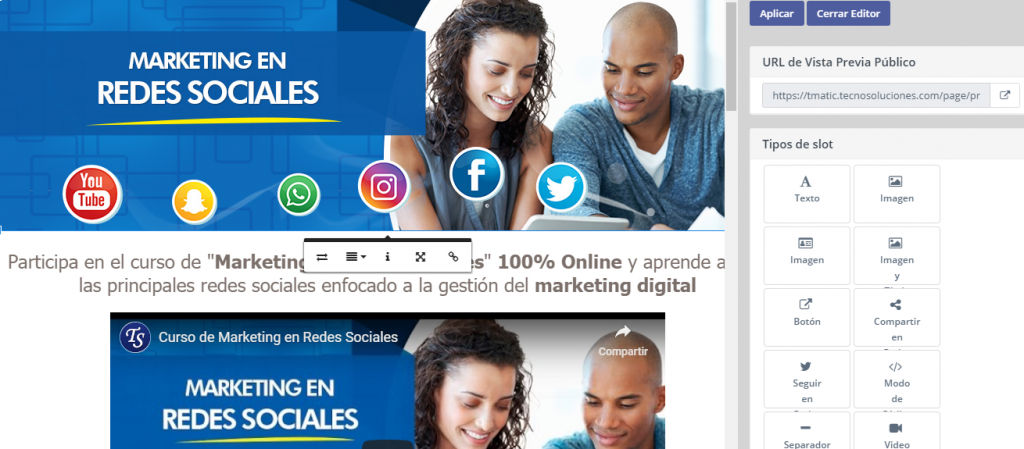 Cada parte de la plantilla es editable mediante arrastrar y soltar. Haga clic en un cuadro de texto para editar. Haga clic en una imagen para reemplazar. Cuando este satisfecho con lo realizado, simplemente haga clic en “Cerrar Editor” y verá una representación de la página.